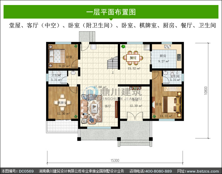 一 層: | 堂屋、客廳(中空)、臥室(附衛生間)、臥室、棋牌室、廚房、餐廳、衛 生間 | |||