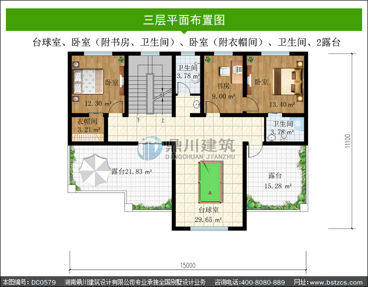 三 層: | 臺球室、臥室(附書房、衛生間)、臥室(附衣帽間)、衛生間、2露臺 |