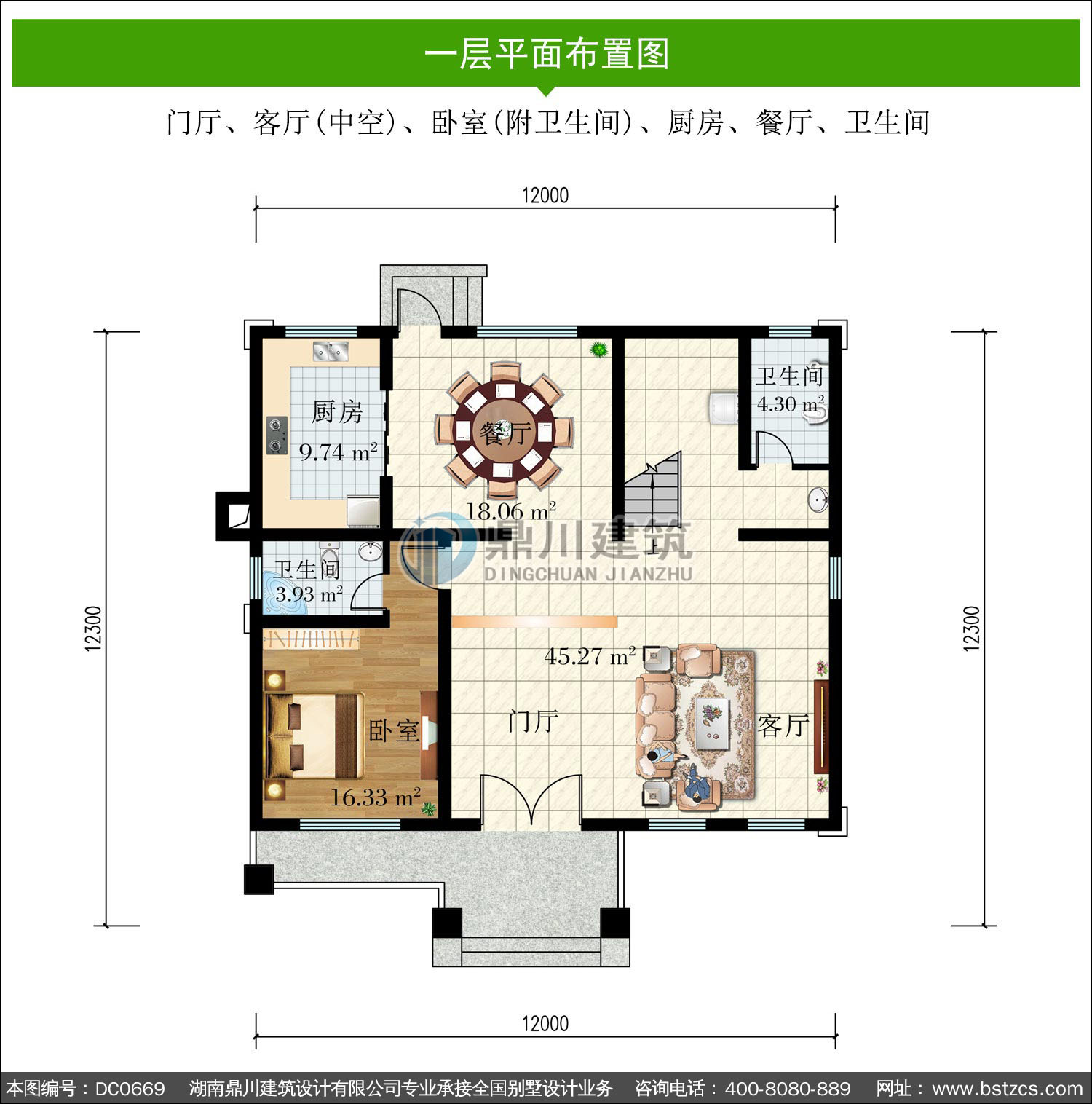 一 層: | 門廳、客廳(中空)、臥室(附衛生間)、廚房、餐廳、衛生間 | |||