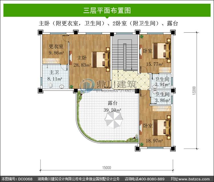 三 層: | 主臥(附更衣室,衛(wèi)生間)、2臥室(附衛(wèi)生間)、露臺 |
