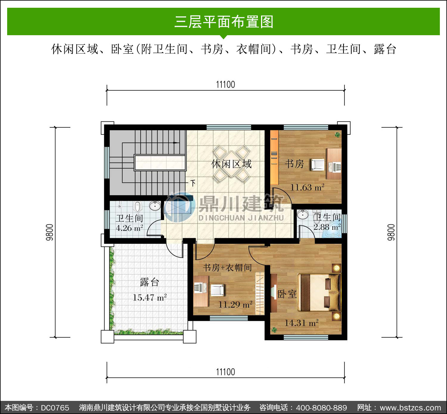 三 層: | 休閑區域、臥室(附衛生間、書房、衣帽間)、書房、衛生間、露臺 |