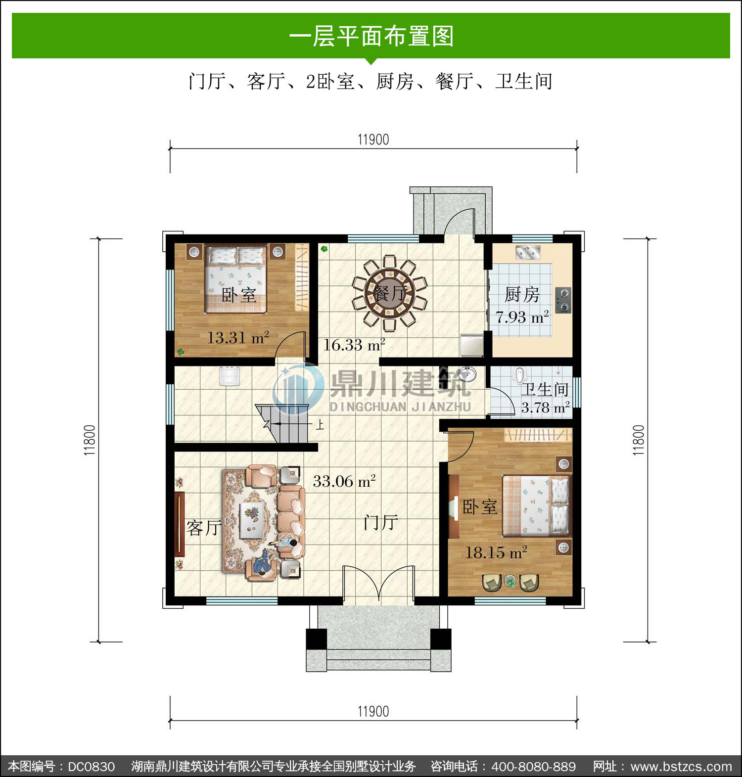 一 層: | 門廳、客廳、2臥室、廚房、餐廳、衛(wèi)生間 | |||