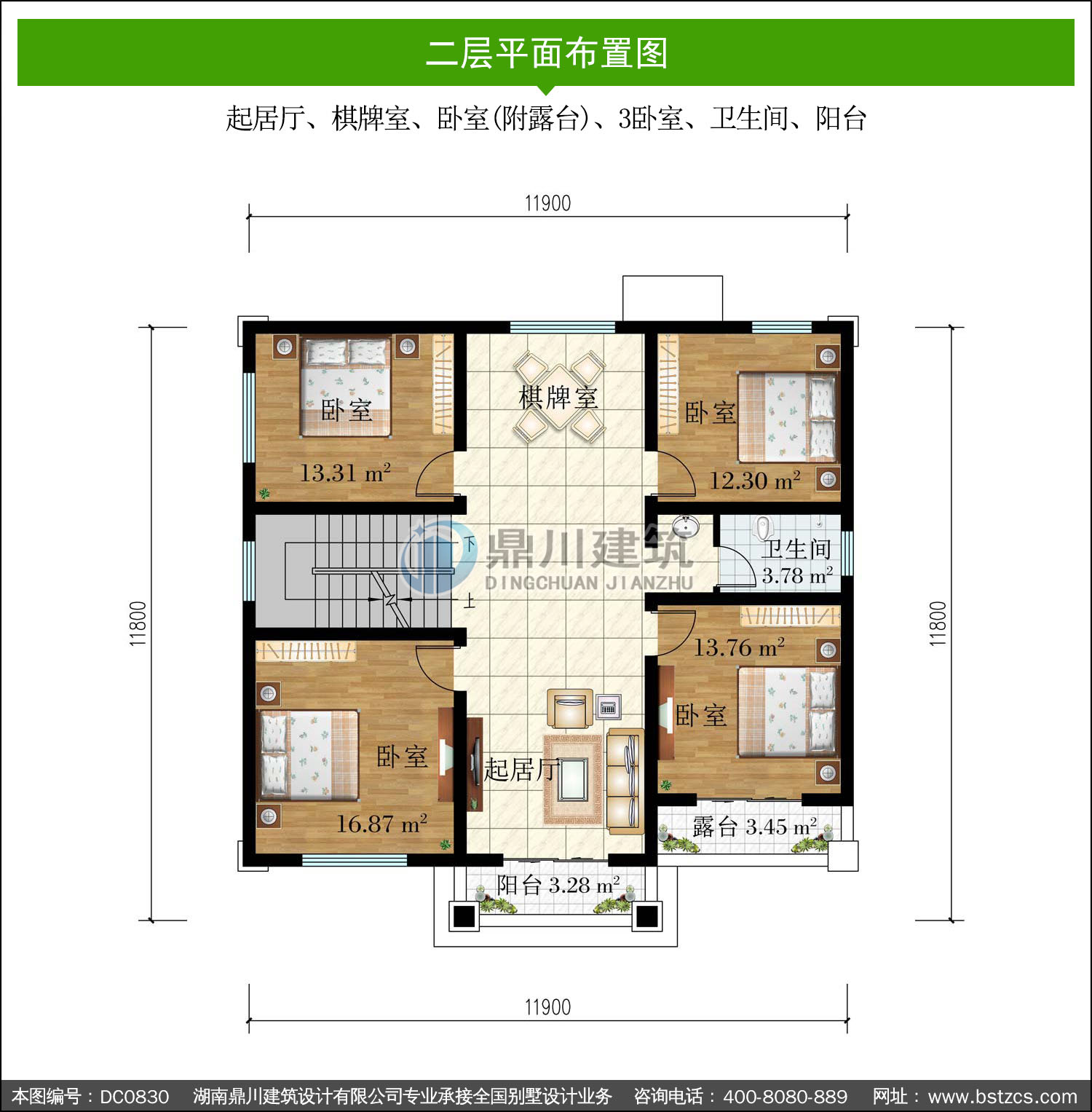 二 層: | 起居廳、棋牌室、臥室(附露臺(tái))、3臥室、衛(wèi)生間、陽臺(tái) |